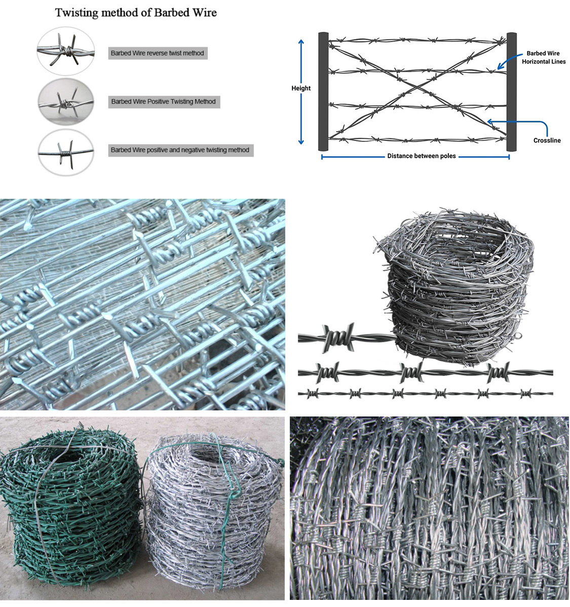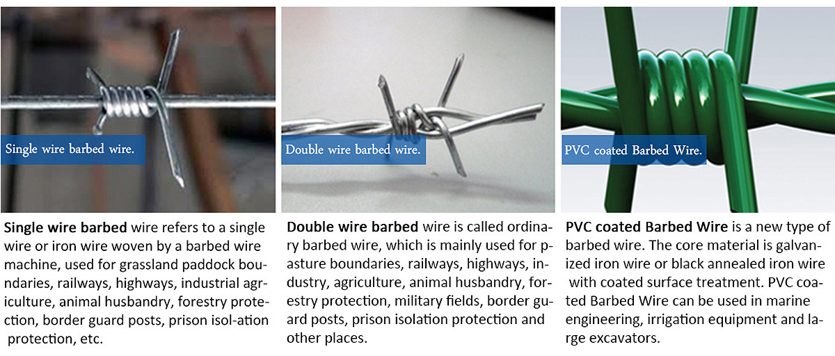 The barbed wire is twisted and braided by a fully automated barbed wire machine. Divided into Single wire barbed wire and Double wire barbed wire. Surface treatment process: electro-galvanizing, hot-dip galvanizing, plastic coating, plastic spraying. There are blue, green, yellow and other colors. Mainly used for isolation and protection of grassland boundaries, railways, highways, etc..