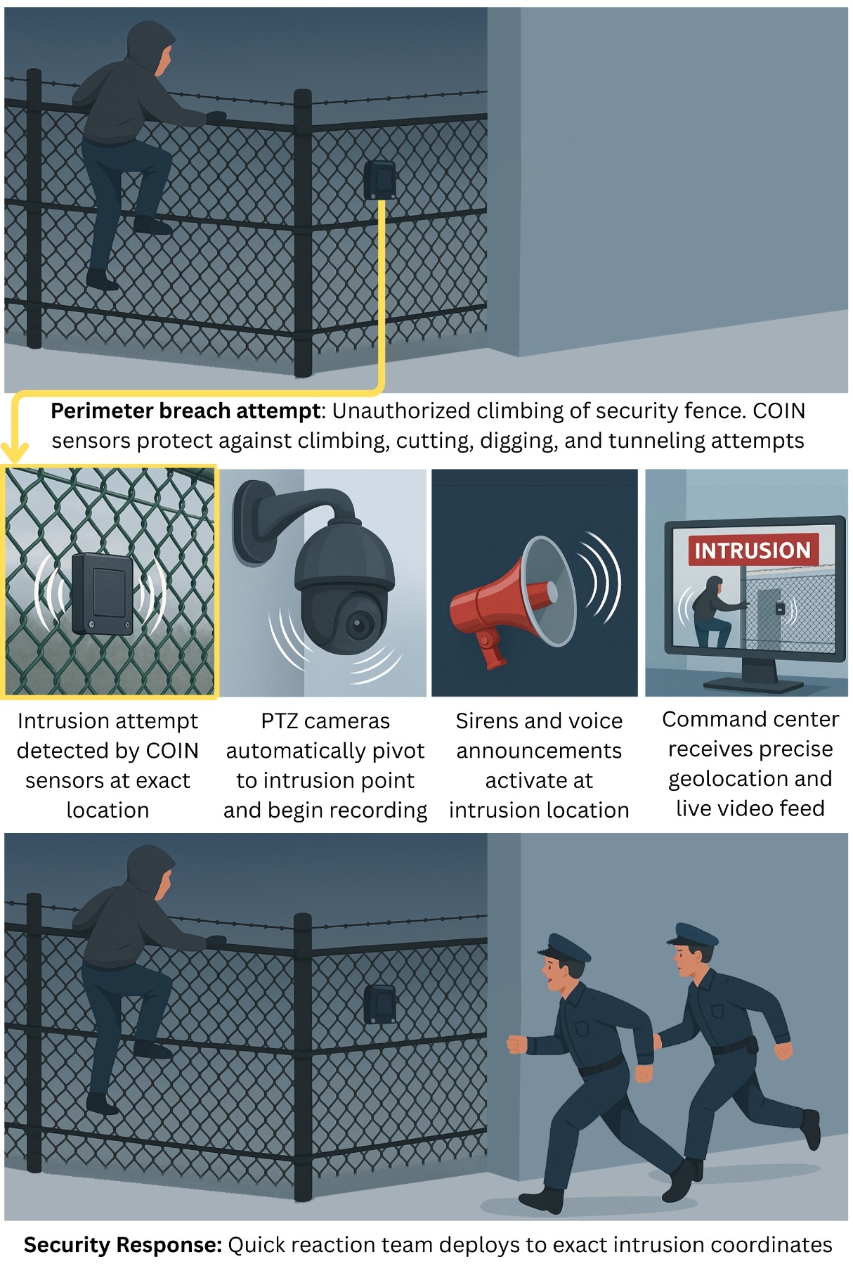 These systems can provide real-time monitoring of the perimeter and send alerts to security personnel or authorities when a breach is detected.