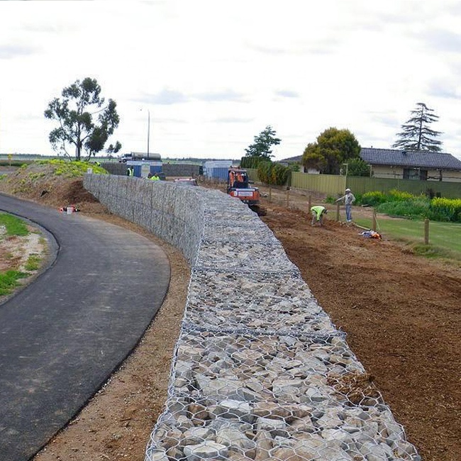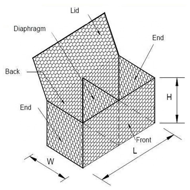 Gabion basket also named gabion box, is weaved by corrosion resistance, high strength and good ductility galvanized wire or PVC coating wire through mechanical. Wire's material is zinc-5% aluminum alloy (galfan), low carbon steel, stainless steel or iron.